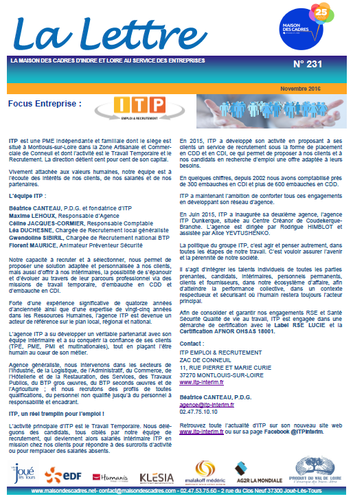 Dans leur lettre d’information N° 231 de Novembre 2016 destinée aux adhérents et aux entreprises, la Maison des Cadres d’Indre-et-Loire a choisi ITP comme Focus Entreprise.
